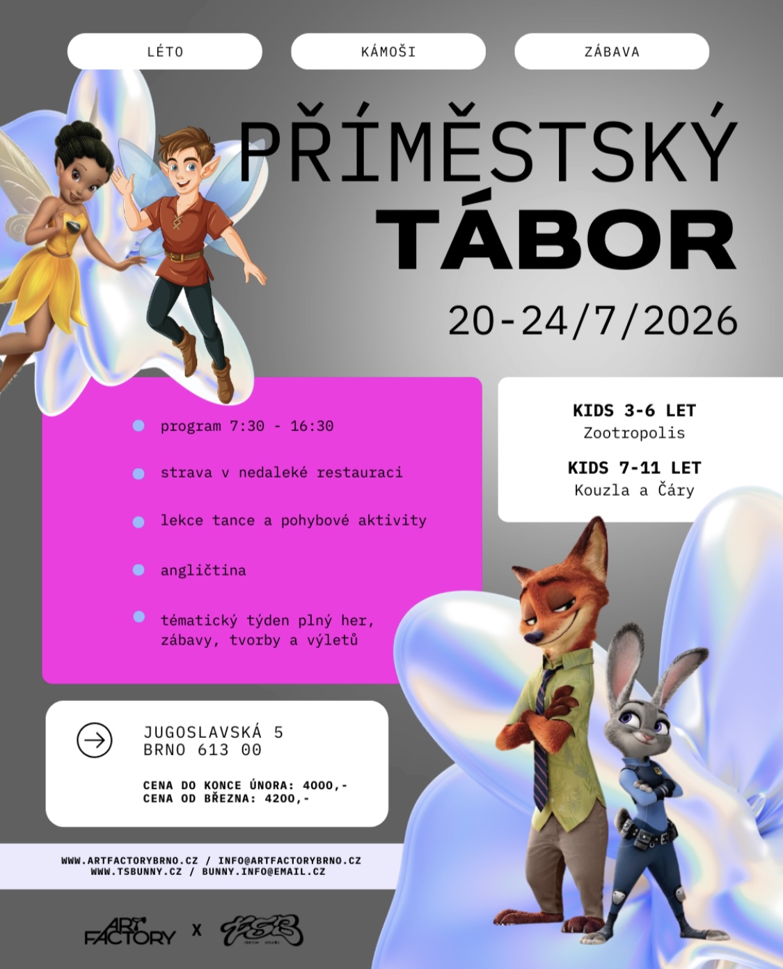 🎯 Co děti čeká? - Tanec & zábavný movement - Angličtina - Tématický program - Tvoření - Hry - Výlet - Nová přátelství - Bezpečné a inspirativní prostředí Přihláška je závazná po odeslání přihlášky a uhrazení zálohy do 14 dnů od registrace. Rezervační záloha ve výši 1 500 Kč je nevratná (slouží k rezervaci místa a pokrytí organizačních nákladů). ! Možnost zakoupení i jednotlivých dní: 1 den / 1200,- kč ! V tomto případě nás prosím kontaktujte na email.